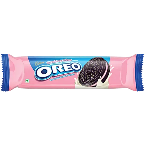 Oreo: milk’s best friend for over 100 years! Cadbury Oreo Strawberry creme sandwich biscuit consists of two chocolatey biscuits with a rich strawberry creme filling between them. Cadbury Oreo creme biscuits are made with cocoa, which defines their unique chocolate flavour. Add this crunchy delight to your snacks and gift yourself rich and smooth joy. Oreo biscuits are perfect for snacking or enjoying as a treat at any time of the day. Twist, lick and dunk! Enjoy Oreo sandwich cookies with a glass of milk or add them to your favourite recipes such as cakes and milkshakes! Add a scoop of vanilla ice cream to Oreo biscuits to make your own creamy dessert! Available in single & family/ combo packs. This biscuit pack is suitable for vegetarians.
