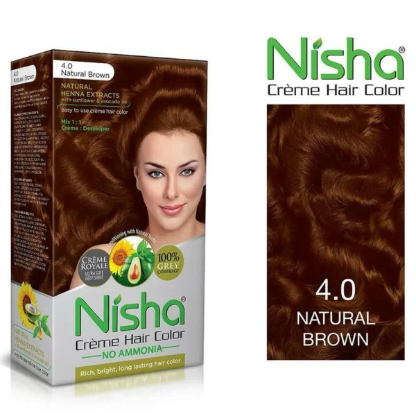 Now, pamper your hair to professional hair-colouring from the comfort of your home. Nisha No Ammonia Creme Hair Color, Natural Brown (4.0) 60 g + 60 ml + 18 ml will provide you with a rich and long-lasting colour effectively covering your greys. It is time to give your hair a new makeover by colouring it from root to tips with easy and convenient application. So what are you waiting for? Go ahead and buy this product online today.