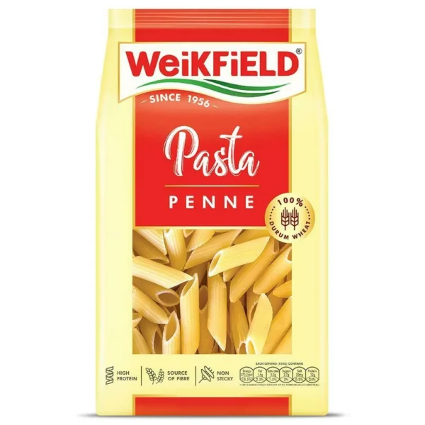 Weikfield Penne Pasta, is made with Durum Wheat Semolina and contains no maida. It is a vegetarian product fortified with Iron and Micronutrients. It has zero trans fat, zero cholesterol, is rich in Protein and Fiber, and makes for a healthy option for meals, snacks, and lunch boxes. It’s shape and non sticky texture makes cooking it in any sauce an absolute delight as it holds the sauce perfectly, allowing you to savour its true flavors. Gives a delicious bite and mouth feel. Weikfield Pasta is also available in elbow, fusilli, shell spaghetti varieties. So what are you waiting for? Go ahead and buy this product online today!
